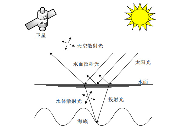 自然界中的全部物質(zhì)都具有光譜特征,不同物質(zhì)的光譜特性不同,光譜的差異與物質(zhì)的差異呈正相關。海洋水質(zhì)遙感監(jiān)測的原理是根據(jù)純凈水體和其他水體具有不同的光譜特性,在衛(wèi)星上搭載傳感器接收一定波長范圍內(nèi)的輻射值,分析水質(zhì)參數(shù)對特定波長的光的吸收和散射情況,結合光譜和水質(zhì)參數(shù)濃度的數(shù)學關系,最終反演出各種水質(zhì)參數(shù)的濃度值。如下圖所示,衛(wèi)星遙感監(jiān)測時衛(wèi)星上的傳感器接收到三部分的太陽輻射: